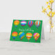 C'est la carte d'anniversaire pour les aventuriers qui aimeraient faire un tour en montgolfière. Une police de script, avec le joyeux message d'anniversaire sur une carte verte avec 8 ballons à air chaud de couleur différente.