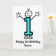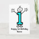 Dessin animé mignon d'un petit garçon bleu souriant Numéro 1. La carte dit 'Joyeux 1er anniversaire'. Envoyez ceci à ce bébé garçon spécial pour son premier anniversaire. La personne de dessin animé drôle agite la main et lève les bras. La carte a un fond blanc, mais il est facile de la modifier pour une couleur différente. Personnalisez facilement cette carte en modifiant le texte du modèle sur le devant et à l'intérieur. Merci de consulter mes créations !