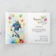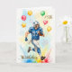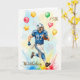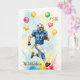 Carte d'anniversaire amusante avec footballeur courant avec une balle entourée de ballons d'anniversaire, feux d'artifice, tout en éclaboussant à travers la boue et l'eau en couleurs sous ses bottes.