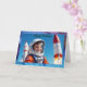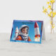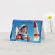 Le devant de cette carte d'anniversaire est orné d'un jeune garçon habillé d'un costume astronaute orange vif, avec un casque et un drapeau américain sur sa manche. Il sourit joyeusement, se tenant sur un fond de roquettes prêtes à être lancées. Le ciel bleu vif souligne le thème de l'espace, avec une fusée qui décolle visiblement, symbolisant l'aventure et l'exploration. Les mots "Joyeux Anniversaire" sont affichés en haut dans une police bleue accrocheuse avec un contour noir, se mélangeant parfaitement avec le cadre de l'espace. La carte est encadrée d'une galaxie vibrante et chatoyante de bleus et de violets, ajoutant une touche cosmique éclatante. Cette carte est parfaite pour un enfant qui aime l'espace, les fusées et les rêves d'explorer l'univers, ce qui en fait un choix fantastique pour un anniversaire rempli d'imagination et d'excitation.