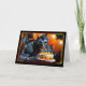 Cette carte présente un design d'anniversaire sur le thème d'Halloween passionnant et ludique. Le point central est un loup-garou féroce avec des crocs pointus et des yeux rouges brillants, penché en avant avec une expression intense. Le loup-garou tient un gâteau d'anniversaire décoré de glaçage orange et noir, surmonté de bougies allumées qui ajoutent une lueur chaleureuse à la scène. Derrière le loup-garou, il y a des ballons orange et un fond festif avec des décorations d'Halloween, y compris des guirlandes et des lumières scintillantes.
