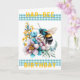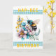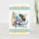 Carte d'anniversaire Hap-Bee. Une aquarelle d'une abeille qui tourne autour de jolies fleurs. Une bande de en vichy turquoise au-dessus et au-dessous de l'image principale, avec les mots 'Hap-Bee' Birthday' dans un jaune foncé. Les couleurs principales sont le turquoise, le jaune et le violet muet. A l'intérieur du message dit : "Je vous souhaite une merveilleuse journée." Ce message peut être customisé pour écrire vos propres mots spéciaux.