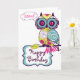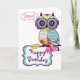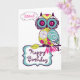 Illustration de chouette rouge chartreuse, rose chaud, bleu et violet foncé ornée de motifs floraux. C'est une carte d'anniversaire amusante et féminine pour votre famille et vos amis.