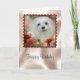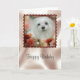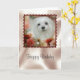 Cette Carte d'Anniversaire présente un portrait de Snowdrop, un doux petit chien maltais avec quelques belles fleurs de focus souple et un cadre élégant à échalotes.