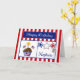 Cette carte d'anniversaire patriotique fera sourire votre militaire Nephew. Cette carte colorée présente un arrière - plan rayé rouge et blanc, un cupcake au chocolat aux étoiles, des drapeaux américains, un coeur de drapeau et une bougie, des étoiles rouges, blanches et bleues, une étiquette de chien estampillée "USA" et une bannière bleue avec le texte "Joyeux anniversaire" en blanc. ©2015 Chien Tags & Bottes de combat Cartes militaires par Sherry Harris