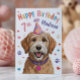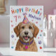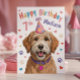 Cette jolie carte d'anniversaire de chien de 7e anniversaire comprend un chien Goldendoodle mignon dans un graphique casquette d'anniversaire. Sur le devant, vous pouvez personnaliser en ajoutant le nom de la personne qui reçoit cette carte d'anniversaire. Vous pouvez changer l'année si vous le souhaitez (par exemple, au lieu de "3ème" anniversaire, il peut dire "2ème" anniversaire). Le message amusant mais mignon à l'intérieur de cette carte dit "Espoir que votre anniversaire soit vraiment extraordinaire !". Profitez de cette carte d'anniversaire de chiot Goldendoodle rose et violet!