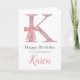Bonne carte d'anniversaire pour elle ! Cette carte est pour une lettre K (voir le reste de notre boutique pour d'autres lettres). La grande lettre K principale est fixe mais tous les autres textes peuvent être personnalisés pour répondre à vos besoins !