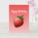 Délicieuse fraise rouge sur une carte d'anniversaire joyeux pliée.