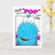 Un Monstre Fuzzy Bleu Whimsical est "Popping" par pour vous souhaiter un Anniversaire Monstrly Fun ! Le Monstre Bleu est un dessin animé dessiné à la main, qui est scanné en format numérique. La carte a un fond blanc avec des lettres noires et roses.