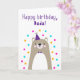 Carte d'anniversaire pour Dada. Si vous appelez votre père Dada au lieu de papa, cette carte d'anniversaire est parfaite pour lui. Votre dada va adorer le design mignon, moderne, coloré, scandinave de cette carte d'anniversaire qui comprend un ourson en peluche marron et gris avec un casquette de fête violet et des confettis rose, jaune et bleu avec le texte "Joyeux anniversaire, Dada !" Rendre cette carte personnalisable ! Cliquez sur "Edit Design", "Inside Bottom/Right : Text & Images", "Text" et "Add text" pour écrire votre propre message personnalisé à Dada intérieur!