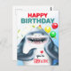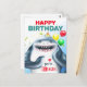 Requin rougissant portant un chapeau de fête avec des ballons.