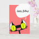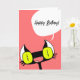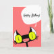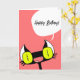 Une carte d'anniversaire joyeuse et amusante avec un chaton en dessin animé noir aux grands yeux jaunes et un sourire ludique et expressif. Parfait pour souhaiter à une fille spéciale un anniversaire joyeux et mémorable rempli de rire et d'amour.