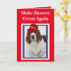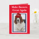 Carte d'anniversaire "Rendre les Bassets Grands Encore" en rouge, blanc et bleu avec un os