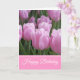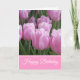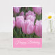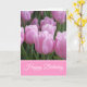 Carte d'anniversaire avec une photo imprimée de jolis tulipes roses. Texte : Joyeux Anniversaire/Vierge à l'intérieur. Customisez cet objet et ajoutez votre propre message spécial ou achetez tel quel.