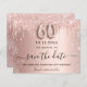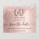 Une carte d'annonce de fête d'anniversaire 60 ans girly et tendance. Fond dégradé or rose orné de gouttes de paillettes or rose et argenté. Personnalisez et ajoutez une date et un nom/texte. Le texte : Sauvegarder la date est écrit avec un grand script à la main tendance avec des fioritures. Numéro 60 avec une police de style ballon.