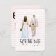 Un design simple et moderne pour annoncer une date à retenir. Le recto présente l'illustration d'une mariée et d'un marié se tenant par la main, accompagnée de l'annonce « save the date ». Le verso suit le thème de couleurs rose, marron et blanc. Il comporte le nom de la mariée et du marié en grandes lettres grasses en haut. Et en bas, suivent la date et les détails du lieu.