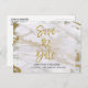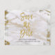 Carte d'annonce de mariage moderne en marbre or et blanc pour un mariage élégant. Cette carte d'annonce de mariage contient des lettrages brossés avec feuille d'or fausse dans la typographie.