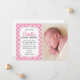 Envoyez à vos amis et à votre famille la merveilleuse nouvelle de l'arrivée de votre petit bout avec ces cartes d'annonce de naissance personnalisables. Un design merveilleux avec un fond rose et des cœurs. Le bébé garçon est également disponible dans ce style.