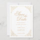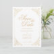 Carte de mariage islamique musulmane blanche et dorée "Save The Date". Annonce de style vintage avec cadre baroque dans les coins qui peut être utilisée pour la cérémonie Nikah, Mehndi et Walima. Il y a une police de calligraphie de luxe de couleur or. Personnalisez la couleur, le type et la taille des polices ainsi que la couleur de la carte. Sur la deuxième carte, vous pouvez ajouter du texte. Différents types de papier sont à votre disposition. HerLineForDesign par Ayesha A.Hussain.