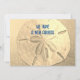Annonces de nouvelle adresse avec image de dollar de sable. Annoncez une nouvelle adresse sur la côte avec des cartes plates personnalisées qui ont des modèles de texte au recto et au verso. Un dollar de sable réaliste sur le devant avec une police moderne imprimée en bleu foncé. Une vue de l'océan vers les maisons sur la plage est l'image de fond pour le texte au verso.