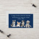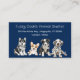 Cartes de visite avec dessin de chien, et thème animal, sur couleur bleu marine foncé. Le texte est gris clair, pour customiser en deux endroits. Quatre petits sont assis au bas des cartes horizontales et ils comprennent, Husky / Malamute, Corgi, Border Collie, et les races Dalmation. Le dos des cartes est gris solide.
