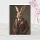 On the front of the card a well-dressed rabbit is shown from the waist up against a softly blurred, earthy backdrop, with warm brown fur, long whiskers, and deep dark eyes that seem to hold a tender, knowing gaze 🐇. He wears a three-piece outfit with a crisp white shirt, a dark tie with a faint texture, a fitted vest with small golden buttons, and a chocolate-brown jacket that sits neatly on his shoulders. His paws rest in the jacket pockets, giving him an easy, self-assured posture, like he’s waiting for a close friend to step in beside him. Tucked where a pocket accent would usually go are three tiny orange carrots with leafy green tops, adding a sweet, affectionate wink to the formal look 🌷. Soft side lighting brings out the texture of the fur and the gentle sheen of the fabric, keeping the mood quiet and intimate rather than stiff. The greeting text appears near the top in a simple, light-colored font that stands out softly against the muted background, with a smaller line of text placed near the bottom in a darker tone. The carrots sit upright at the jacket’s chest pocket, their bright orange color popping against the deep brown fabric.
