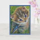 "Curious Kitten No. 1" Watercolor Art Greeting Card de l'artiste Jean Weiner "Curious Kitten No. 1" présente un jeune chat tabby brun étudiant une libellule bleue qui a atterri sur une lame d'herbe. Son regard est enfermé sur cet insecte ailé, qui semble l'étudier en retour. Ce chaton est fasciné par tous les insectes volants dans son propre jardin. Cette oeuvre ravira tous les amoureux de les chats ! Ce produit a été conçu à l'aide de la peinture originale de l'aquarelle de l'artiste Jean Weiner, "Curious Kitten No. 1". Tous les droits de reproduction sont réservés.