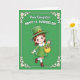 This greeting card features a cheerful young girl in a cute anime-inspired style, standing against a rich green background with a sweet, friendly glow in her rosy cheeks and wide, sparkling eyes 💚. She wears an emerald leprechaun hat with a gold buckle and a matching green dress trimmed in soft white at the collar and cuffs, giving her a cozy, dressed-up look. Light brown boots and white socks ground the outfit with everyday detail, like she’s ready to skip over for a hug or a laugh with someone close. Instead of a pot of gold, she lifts a shiny golden cauldron overflowing with fuchsia blossoms, adding a surprising pop of color that feels like a thoughtful gift ☘️. The scene is framed by a delicate white border of curling vines and small flowers, gently wrapping around her like a decorative embrace. At the top, “Dear Daughter” sits above “HAPPY ST. PATRICK’S DAY,” both in white lettering that stands out clearly against the green. The white floral-and-vine frame continues evenly around the edges, with the bright blossoms clustered high in the raised cauldron.