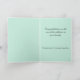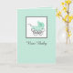 Stylish new mint green baby greeting card, with graphics of a mint green and gray baby pram, on a white background, et set in a gray square frame. Gray text, reads New Baby, on the outside, with greeting on the inside. Personalize the text to suit your needs.