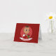 Carte de vœux avec une illustration d'une adorable petite fille ou d'un petit garçon souriant et heureux, le bébé porte des vêtements rouges et blancs et tient un cadeau ; avec un modèle de texte modifiable pour votre nom ou message, conception pour les fêtes de Noël avec un fond rouge