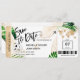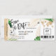 Billet de billet d'avion de mariage de destination de plage Or Billet d'embarquement Enregistrer la date avec l'icône de cœur et d'avion avec des feuilles tropicales