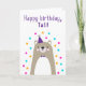 Carte d'anniversaire pour Tati. Si vous appelez votre père Tati au lieu de papa, cette carte d'anniversaire est parfaite pour lui. (Tati signifie père en yiddish et serbe.) Votre tati va adorer le design mignon, moderne, coloré, de style scandinave de cette carte d'anniversaire qui comprend un ourson en peluche marron et gris avec un casquette de fête violet et des confettis rose, jaune et bleu avec le texte "Joyeux anniversaire, Tati !" Rendre cette carte personnalisable ! Cliquez sur "Edit Design", "Inside Bottom/Right : Text & Images", "Text" et "Add text" pour écrire votre propre message personnalisé à Tati à l'intérieur !
