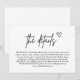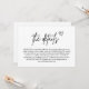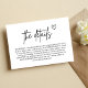 La "Minimal manuscrite Script Mariage Encape Card" allie simplicité et touche personnelle. Doté d'un élégant script manuscrit, cette carte transporte magnifiquement les détails mariages essentiels tels que les directions, les hébergements ou les notes spéciales. Son design minimaliste permet à l'écriture gracieuse de prendre le devant de la scène, créant une atmosphère chaleureuse et intime. Parfait pour les couples à la recherche d'une touche moderne mais chaleureuse, cette carte d'enceinte ajoute un charme unique à votre papeterie mariage, assurant à vos invités un sentiment d'accueil et d'information.