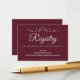 Cette belle carte de boîtier de registre mariage facilitera l'obtention par vos invités de toutes les informations dont ils ont besoin au sujet de votre registre mariage. Conçu dans le cadre de notre Suite de Mariage Elégante Gris Bourgogne et Argent, il présente du texte Gris Argent sur un arrière - plan de couleur bordeaux ou rouge vif avec une bordure florale en fausse feuille argent.
