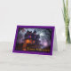 Cette carte d'Halloween présente une scène classique de maison hantée à la fois inquiétante et atmosphérique. Le point central de l'image est une vieille maison de style victorien avec une architecture gothique, dotée de tourelles et d'une véranda qui fait le tour de la maison. La maison est éclairée par une lueur orange inquiétante provenant de ses fenêtres et de ses lumières de véranda, contrastant fortement avec les teintes violettes profondes de l'extérieur. Cette lueur chaude laisse deviner quelque chose de sinistre qui se cache à l'intérieur, tandis que les ombres environnantes ajoutent au suspense.