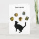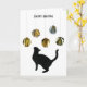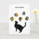 Un chat noir contemple les ornements de boules de papier doré sur cette carte de Noël au style du milieu du siècle.