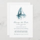 Personnalisez cette carte de changement de date verticale romantique, élégante, belle, propre et fraîche, conçue avec une peinture à l'aquarelle bleue originale d'un voilier, entièrement personnalisable et définie comme modèle pour une personnalisation facile. Design net et frais. Vous pouvez également modifier le style de coin pour cette invitation. *Peinture à l'aquarelle : 2013 © Natasa Borenovic