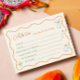 Faites de votre douche nuptiale un produit spécial grâce à cette carte de conseil personnalisée hors du marché pour les Fêtes des mariées! Idéal pour un thème de la douche nuptiale sur le marché des fermiers, cette carte de charme vous permet de partager des conseils sincères et des meilleurs voeux. Conçu pour s'adapter à votre nouveau thème de la douche nuptiale hors du marché, c'est une façon amusante et mémorable de célébrer la future mariée. Idéal pour n'importe quel thème de douche nuptiale hors du marché, cette carte est un souvenir qu'elle chérira pour toujours !