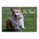 Charlie est corgi d'un Gallois de Pembroke. Elle court à travers l'herbe verte vers la visionneuse dans le mi-saut, avec un grand, sourire de chien de large-ouvert-bouche. Elle a le caramel et les taches blanches--culotte de caramel, côtés, oreilles et corrections d'oeil, avec le ventre blanc, l'avant, le museau et une rayure verticale blanche entre ses yeux à son front. Ses jambes avant courtes sont dans le ciel pendant qu'elle saute en avant. Dans le juste de stimulant de l'image sont les mots, "salut, là !" en manuscrit blanc contre l'herbe. Charlie était mon tout premier client de chien. Copyright Gail Storrs 2007.