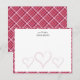 L'avant est blanc avec un mince cadre de motif tartan de la Saint-Valentin rétro en couleur bordeaux. En haut se trouve un nom personnalisé en noir épuré. Trois cœurs bordeaux translucides et doux reposent en bas, donnant un look moderne et doux. Le dos répète le même motif tartan bordeaux pour une finition cohérente. Parfait pour les notes quotidiennes, les salutations et la papeterie personnelle.