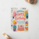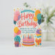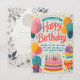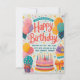 La carte présente un design coloré et festif avec l'expression "Joyeux anniversaire" affichée en évidence dans le centre. Elle est ornée de ballons, de cupcakes, d'un gâteau d'anniversaire avec des bougies et d'une boîte cadeau. L'arrière - plan comprend des étoiles et des points, ajoutant à l'atmosphère festive.
