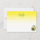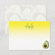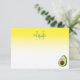 A cartoon style avocado. Custom note cards with monogram. White and yellow background. Edit initial and name to customize.