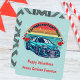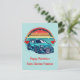 If you modify the size or transfer the design, adjust the image accordingly. This charming illustration features a retro, colorful sun decorated with red hearts and a stylish car, paired with the phrase "You make my heart race." You can customize the "Happy Valentine's" message and include your child's name. The back showcases a playful pattern of tire marks, making this card a fun choice for boys to share with classmates, teachers, friends, and family.