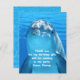 Anniversaire merci cartes à plat avec visage dauphin. Des lettres blanches et ondulées sont utilisées pour créer un message "merci" personnalisé qui est imprimé sur le dauphin. Le dos des cartes a une image d'eau. Choisissez n'importe quelle carte de taille qui correspond à cette conception.