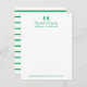 Le design élégant de la papeterie de carte professionnelle qui est parfait pour un propriétaire ou un employé de petite entreprise comprend les initiales de prénom et de nom, le nom dans le script de calligraphie moderne avec un texte classique et élégant qui peut être personnalisé avec un titre d'emploi ou un nom d'entreprise, ainsi que des informations de société ou de contact. Des bandes horizontales (amovibles) élégantes habillent le dos de la carte. Les couleurs verte et blanche peuvent être modifiées.