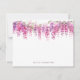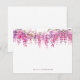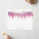 Cette carte de notes présente un design délicat et élégant avec une cascade de fleurs de glycine aquarelle dans les tons rose, lilas et violet accrochés au bord supérieur, créant une bordure douce et accueillante. L'illustration florale complexe montre la beauté des fleurs de glycine, complétée par un feuillage vert subtil. L'esthétique générale est à la fois sophistiquée et sereine, parfaite pour des occasions variées.