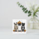 Une charmante illustration représentant trois adorables chats noirs habillés de costumes d'Halloween classiques. De gauche à droite, un chat mignon est enveloppé comme une momie, un chat fantaisiste porte une feuille pour être un fantôme avec un citrouille sculpté sur la tête, et un chat éffrayant-amusant est en tenue squelette. La scène est complétée par des citrouilles festifs et des feuilles d'automne éparpillées, ce qui la rend parfaite pour les projets d'automne et d'Halloween.