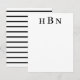 Un design de carte de note plate personnalisée intemporel et élégant avec des lettres noires qui peuvent être personnalisées avec les initiales du prénom, du nom et du deuxième prénom dans un style serif classique. Un espace pour votre note manuscrite est inclus et le verso de la carte présente un motif élégant de rayures noires et blanches horizontales.