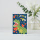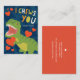 Carte de Saint Valentin mignonne pour les enfants avec une illustration d'un t-rex vert tenant un coeur rouge sur un arrière - plan bleu avec les mots "Je vous choisis". Design par Shelby Allison.