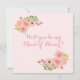 Une carte élégante 'veux-tu être ma demoiselle d'honneur' rose blush floral présente des bouquets de roses aquarelles pastel, d'hibiscus et d'autres fleurs délicates dans des nuances de rose blush et de pêche, avec des feuilles botaniques vertes luxuriantes. C'est posé sur un fond rose pâle.